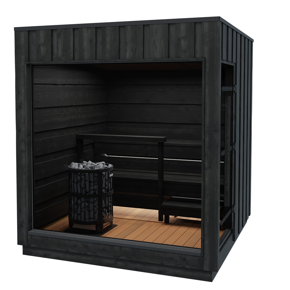 Schwarz lackierte Outdoor-Sauna mit großem PanoramafensterLindea View Large