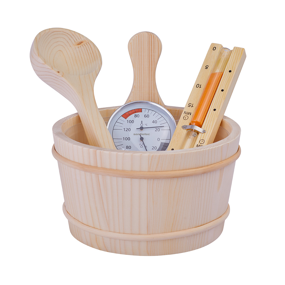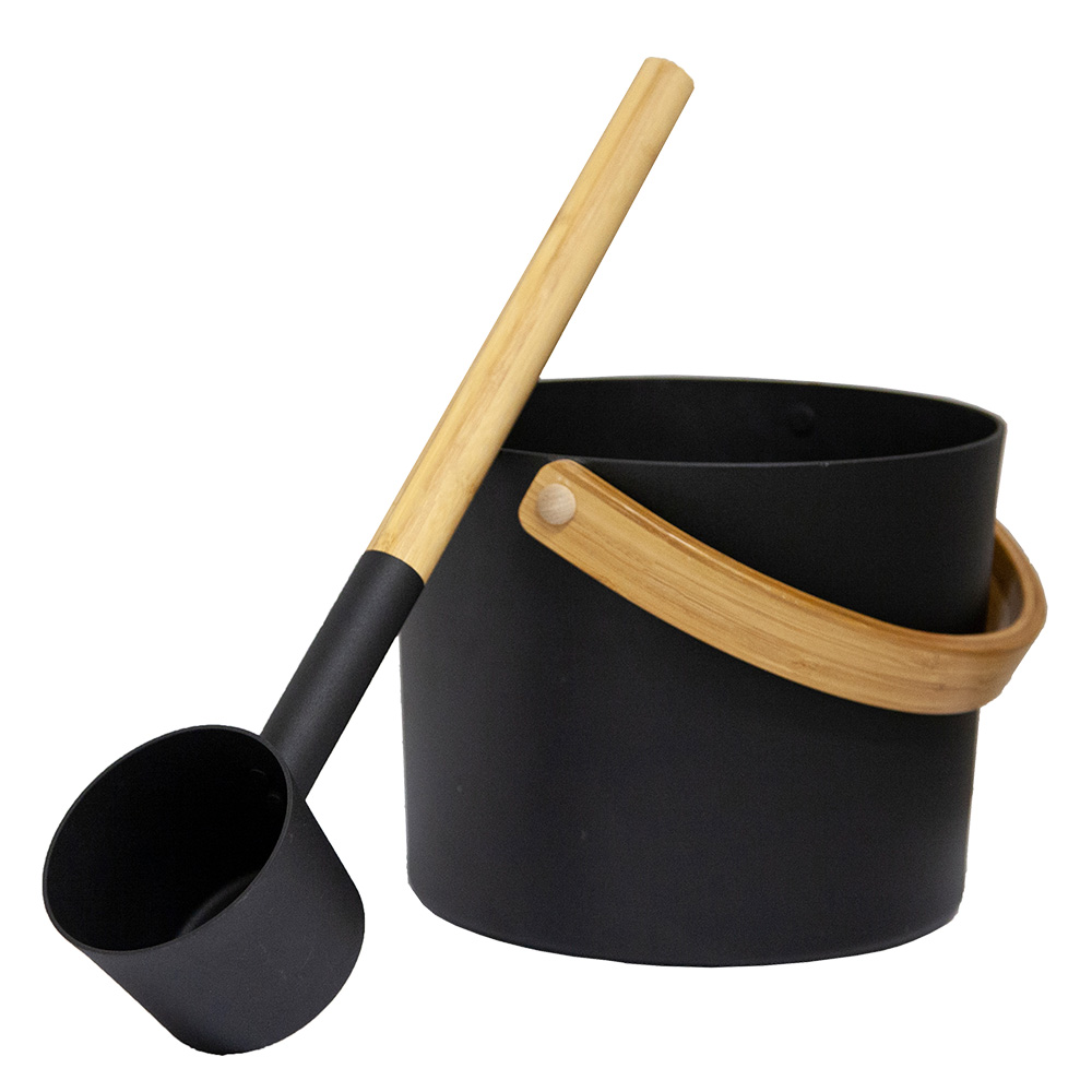 Kompakter Saunaofen mit integrierter SteuerungSchöpfkelle aus Edelstahl mit Holzgriff